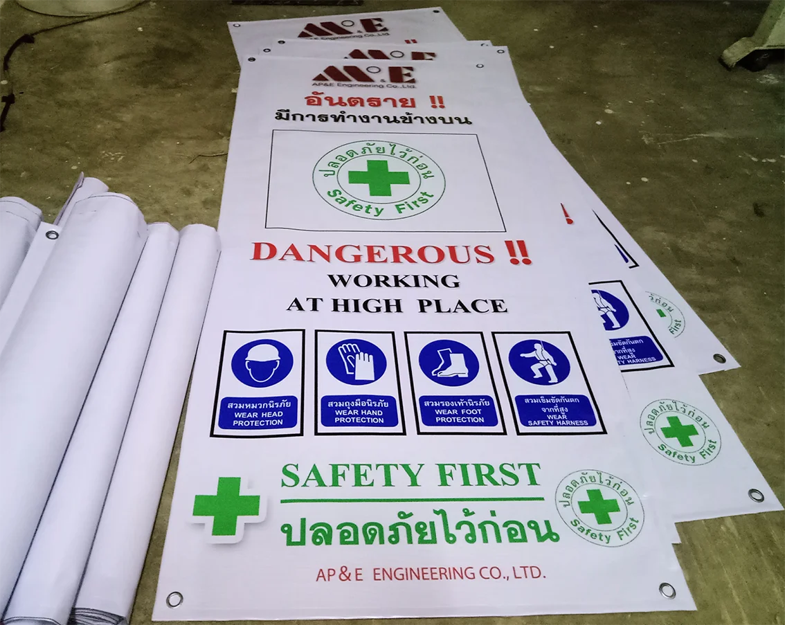 ป้าย Safety ส่วนใหญ่ผลิตจากวัสดุไวนิลเกรดหนา หรือ PP Board เพื่อให้ทนแดดฝนในไซต์งานกลางแจ้ง