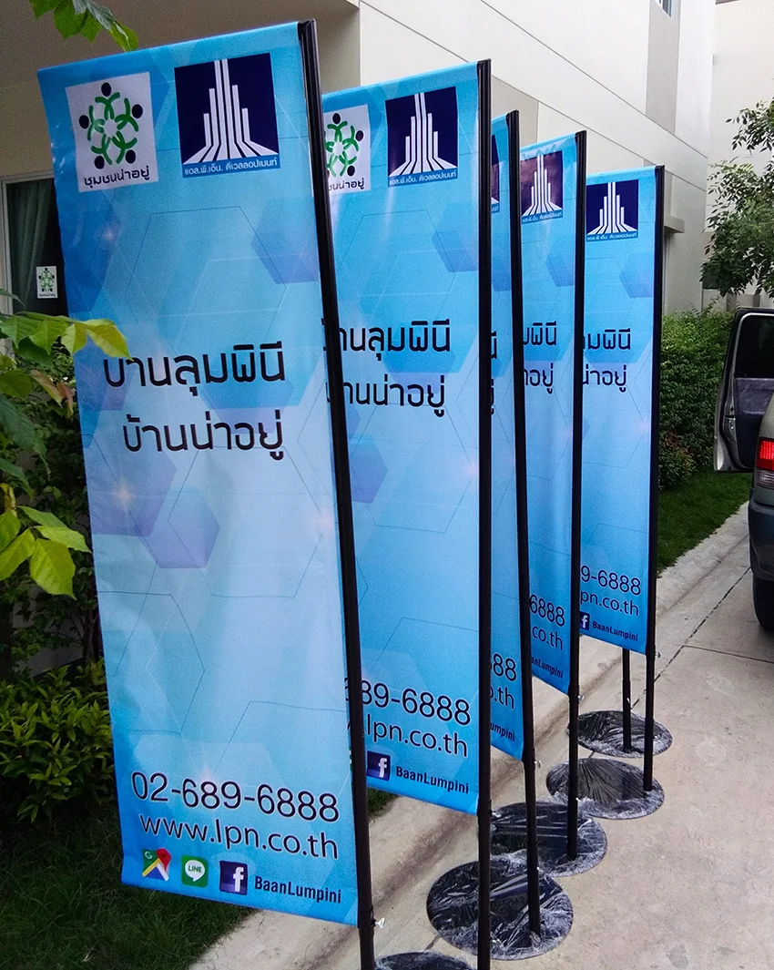 จากผลงานจริงที่ลูกค้าสั่งทำกับร้านพิมพ์ดี (ตามรูป) จะเห็นถึงการเลือกใช้ป้ายธงญี่ปุ่นตั้งเรียงรายตามแนวถนนทางเข้าโครงการ ซึ่งเป็นตัวอย่างที่ดีมากของการใช้ป้ายเพื่อสร้าง “ประสบการณ์แรกพบ” ให้ผู้มาเยือนได้รับรู้ว่าโครงการนี้มีความเป็นระเบียบ สวยงาม และใส่ใจการจัดการพื้นที่อย่างแท้จริง
