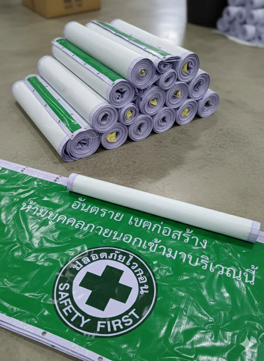 ข้อความ: สั้น กระชับ เช่น “ปลอดภัยไว้ก่อน” หรือ “SAFETY FIRST”