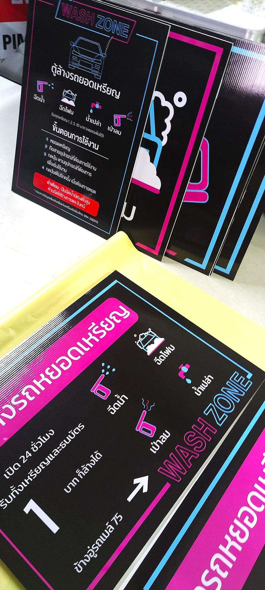 เน้นข้อความสำคัญด้วยตัวใหญ่ เช่น “WASH ZONE”, “บริการล้างรถหยอดเหรียญ”
