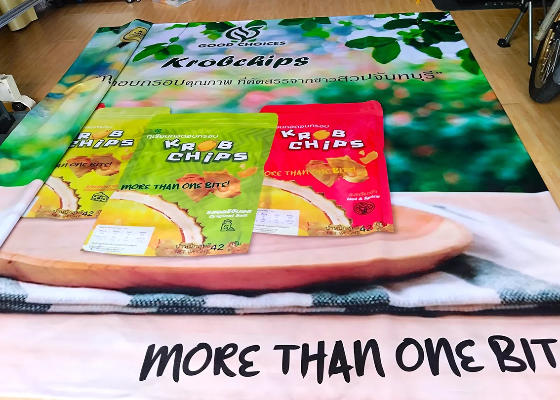 ป้ายฉากหลังของงานบูธถือเป็นหัวใจของการจัดแสดง มันควรสื่อให้คนรู้ได้ทันทีว่าแบรนด์คือใครขายอะไร และมีเอกลักษณ์แบบไหนดีไซน์ของ Krobchips ใช้ภาพใบไม้และผลทุเรียนสื่อถึงธรรมชาติความสดใหม่และแหล่งผลิตจากจันทบุรี ซึ่งเป็นข้อมูลสำคัญที่ช่วยสร้างคุณค่าให้กับสินค้าโดยไม่ต้องใช้คำพูด